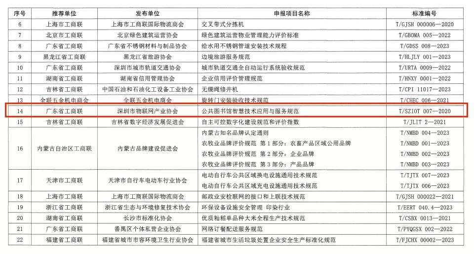近日,中华全国工商业联合会办公厅公布了2024年商会团体标准“领先者”名单,盐田区图书馆牵头编制的《公共图书馆智慧技术应用与服务规范》(T/SZIOT 007—2020)上榜其中,这不仅是首个在图书馆领域的获奖,也是唯一获此殊荣的图书馆领域团体标准。
