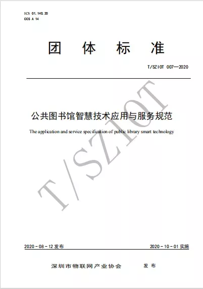 《公共图书馆智慧技术应用与服务规范》团体标准由盐田区图书馆牵头,联合深圳市标准技术研究院等单位共同制定,由深圳市物联网产业协会发布。标准明确智慧图书馆的总体架构,包括智慧感知、流通、互联和管理等关键应用领域,为智慧技术的应用和服务提供分级要求,适用于公共图书馆智慧技术的应用部署与服务提供。