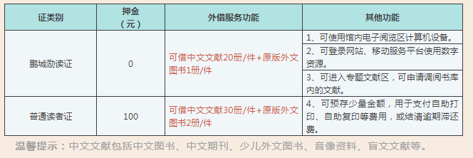 读者可办理的读者证类别调整鹏城励读证和普通读者证2种,鹏城励读证免押金,普通读者证不再做细分,押金统一为100元。99%的读者办理鹏城励读证就可以满足自己的借阅需求了。