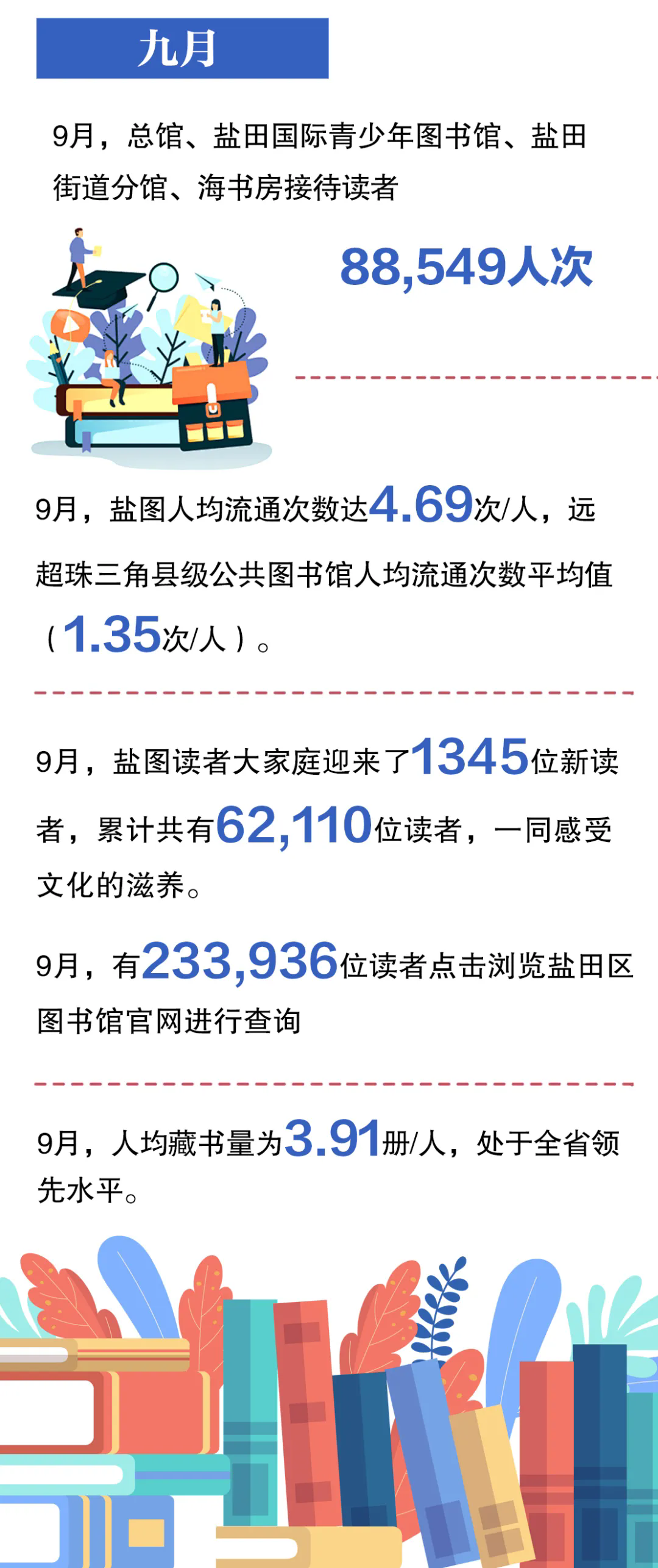 9月,总馆、盐田国际青少年图书馆、盐田街道分馆、海书房共举办阅读活动148场,共61,550人参加,相当于每天5.1场活动。