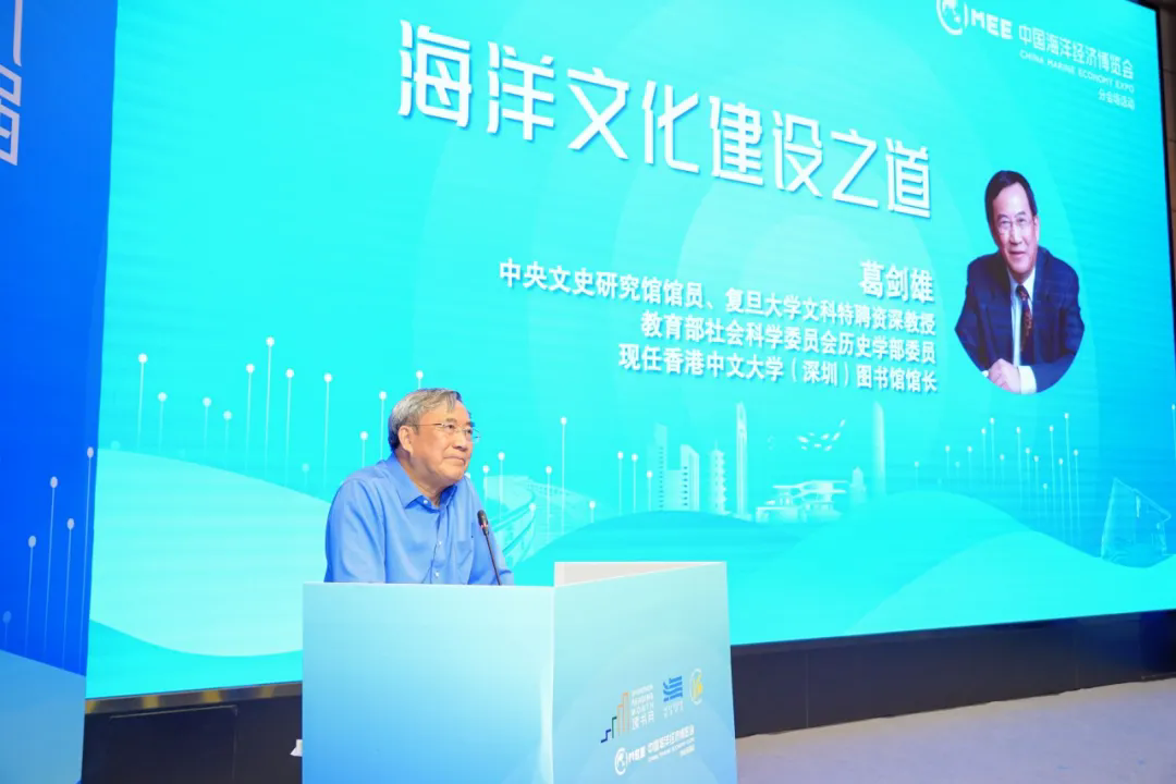 在主旨分享环节,中央文史研究馆馆员、复旦大学文科特聘资深教授、教育部社会科学委员会历史学部委员,现任香港中文大学(深圳)图书馆馆长葛剑雄教授以“海洋文化建设之道”为题,从历史、地理、人文视角阐释了海洋文明演进与当代中国海洋文化建设的路径。