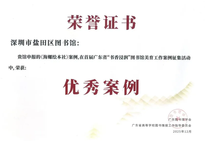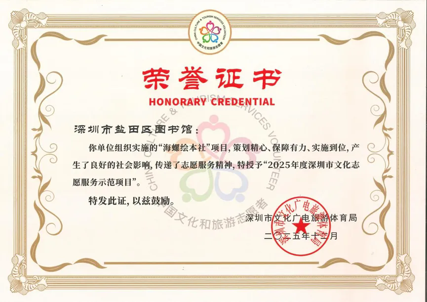 近日,深圳市文化广电旅游体育局公布2025年度文化志愿服务评选结果,海螺绘本社凭借丰硕的文化志愿服务成果,成功获评 “深圳市文化志愿服务示范项目”,成为全市公共文化服务领域的亮眼标杆。